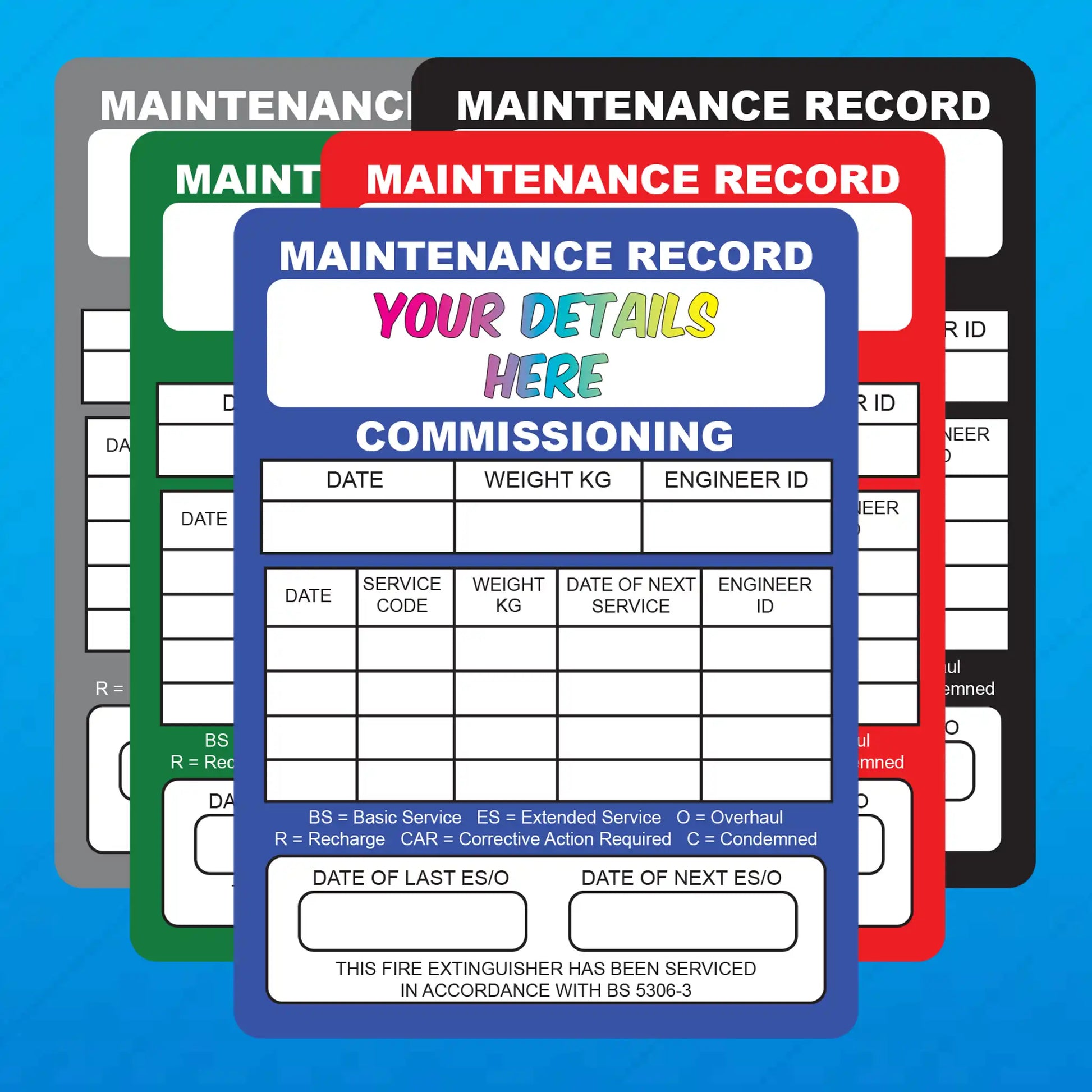 Our personalised fire extinguisher service stickers which conform with BS 5306 are printed in full colour on durable matte permanent vinyl, ensuring long-lasting performance. This tear-resistant, waterproof material allows for easy marking with a permanent marker pen. Designed for application upon installation, these stickers provide a clear record of each extinguisher's maintenance history, including service dates, weight, and the engineer’s ID or name.